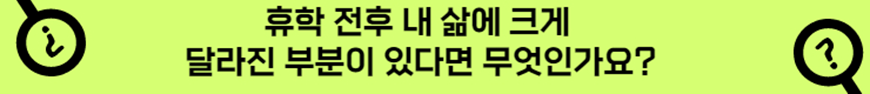 휴학 전에 비해 가장 크게 달라진 점은 삶의 주도성을 찾았다는 점입니다. 휴학 전에 저는 제가 하고 싶은 일을 먼저 찾아서 하기보다 일단 저에게 주어진 일을 해내는 것에 급급했습니다. 휴학하고 나니 앞으로의 계획을 구체적으로 고민해보며 저에게 꼭 필요한 일들을 주도적으로 찾아볼 수 있어 좋았습니다. 그다음으로 크게 달라진 점은 멈추는 것에 대한 막연한 두려움에 맞설 용기가 생겼다는 점입니다. 휴학 전에는 살면서 정해진 길에서 앞으로 나아가는 것을 멈추면 큰일이라도 일어날 줄 알고 늘 고군분투하며 저 자신을 힘들게 할 때도 있었습니다. 하지만 막상 멈추고 쉬어보니 걱정하던 일은 일어나지 않았고 오히려 마음에 여유를 가지고 제 삶을 돌아볼 수 있었습니다.