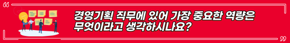 경영기획 직무가 구체적으로 어떤 업무인지부터, 중요한 역량까지 알 수 있었던 시간이 된 것 같습니다. 저 같은 경우에는 경영기획 직무가 수시로 생기는 이슈들을 대처하는 업무가 많다는 점이 조금 신기했습니다. 또 이공계열 전공자로서는 어떤 점이 강점으로 작용하고, 어떤 역량을 키우면 좋을지에 대해서도 잘 알게 되어 정말 유익한 인터뷰였습니다!