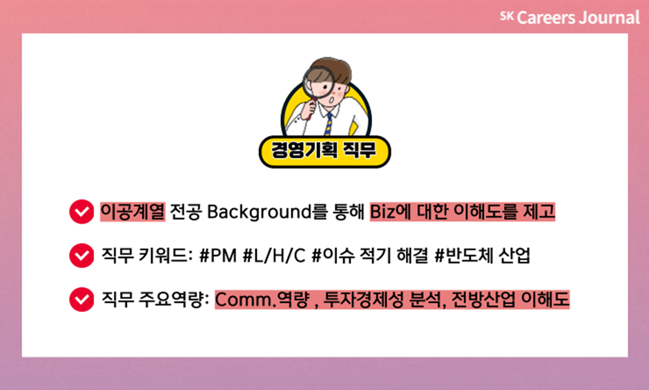 혹시 이공계열을 전공하고 있는 분 있나요~? 그렇다면 여러분들에게 들려드릴 좋은 소식이 있습니다! 오늘의 직무 인터뷰는 바로 ‘경영기획 직무’이기 때문이죠!