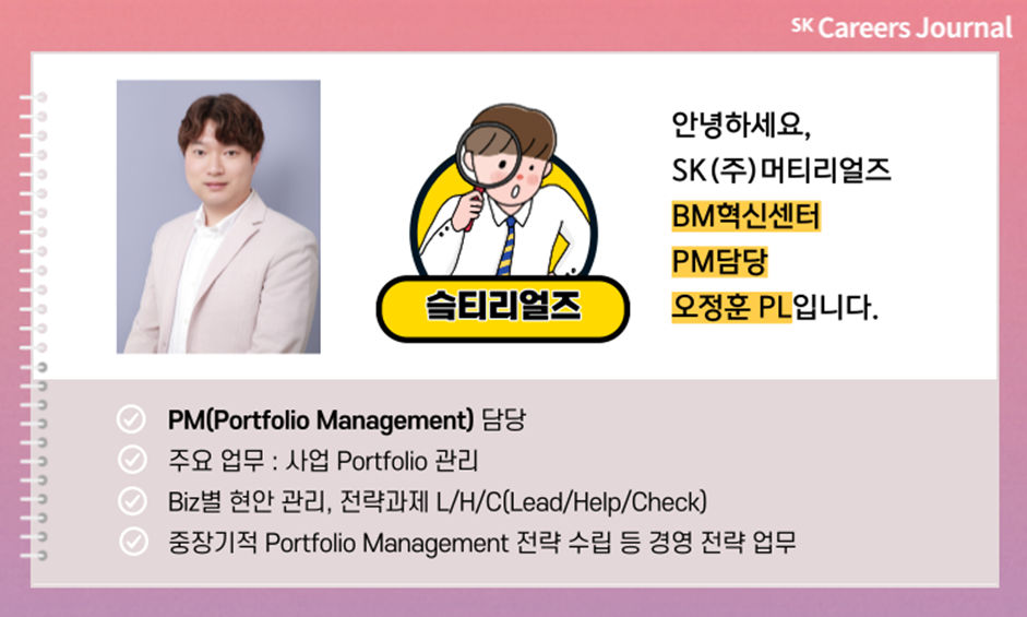그래서 모셔보았습니다! 이공계열을 전공하고 경영기획 직무를 담당하고 계시는 SK머티리얼즈 인터뷰이님을 바로 만나볼까요?