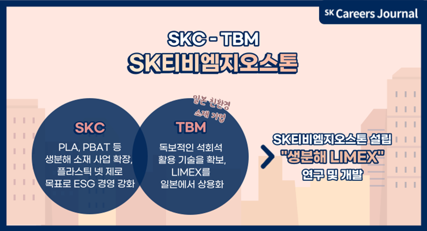 마지막으로 소개드릴 사례는 SK티비엠지오스톤으로, SKC와 일본 친환경 소재 기업 TBM의 합작사입니다. TBM의 기존 LIMEX 기술에 SKC의 PLA, PBAT 등 생분해 소재 기술력을 결합한 생분해 LIMEX를 개발하고 있습니다. 자연에 매장량이 풍부한 석회석을 최대 80%까지 활용하기 때문에 가격경쟁력이 우수하여 시장 확대 효과가 기대됩니다. 글로벌 친환경 사업을 위해 힘쓰는 SKC의 목표 ‘플라스틱 넷 제로’가 달성될 미래가 더욱 기다려지네요!