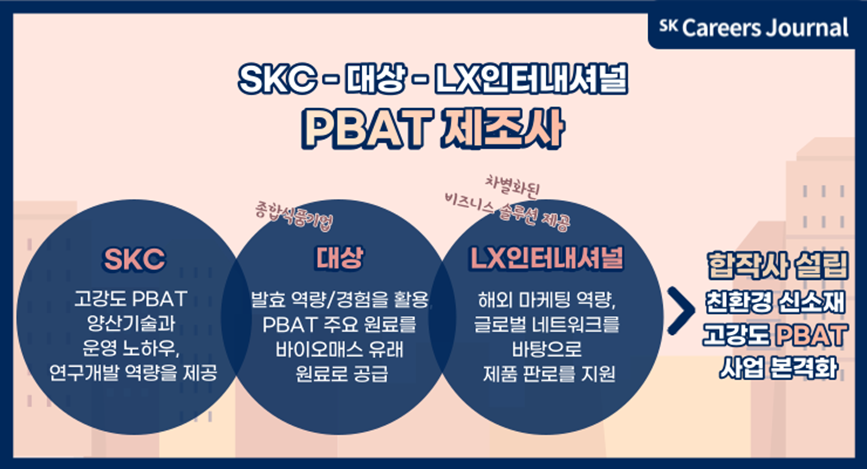SKC는 대상, LX인터내셔널과 함께 PBAT 제조사를 설립하였습니다. 플라스틱 이슈 해결을 위해 생분해성 플라스틱 저변 확대에 힘을 모은 결과입니다. SKC는 고강도 PBAT 양산기술과 운영 노하우, 연구·개발 역량을 제공하고 종합식품기업 대상은 발효 역량과 경험을 활용하여 PBAT 주요 원료(BDO·Butanediol)를 바이오매스 유래 원료로 공급해 친환경성을 높일 수 있습니다. 마지막으로 LX인터내셔널은 60년 이상 쌓아온 해외 마케팅 역량, 글로벌 네트워크를 바탕으로 제품 판로를 지원하여 차별적인 비즈니스 솔루션을 제공합니다. 3사의 역량을 합쳐 PBAT 제조사를 설립하였고, 성장성이 높은 고강도 PBAT의 사업이 본격화되었습니다.