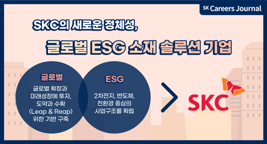 안녕하세요, SKC 취재기자 이수현입니다. 여러분은 SKC에 대해 잘 알고 계시나요? SKC는 모빌리티-반도체-친환경 중심의 소재부품 전문 B2B(Business to Business) 기업입니다. 특수한 소재를 연구 및 개발하며 기업을 대상으로 경영 활동을 전개하는 기업이다 보니, 일반 소비자와 취준생에게는 사업 내용이 익숙하지 않을 수 있습니다.
