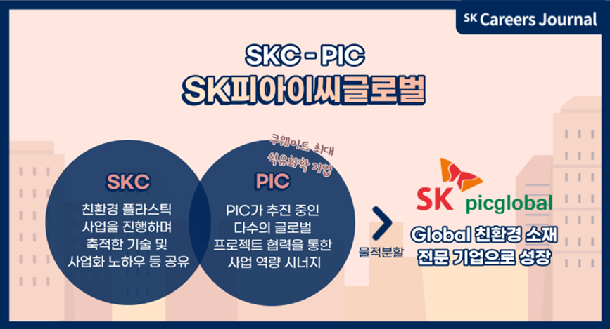 또한, SKC는 쿠웨이트 최대 석유화학 기업인 PIC와의 합작사 SK피아이씨글로벌을 설립하였습니다. 폐플라스틱 자원화, 생분해 플라스틱 등 친환경 플라스틱 사업을 쿠웨이트로 확장하기 위해 시작된 두 기업의 합작사 SK피아이씨글로벌은 글로벌 친환경 소재 전문 기업으로 성장하고 있습니다. SKC는 친환경 플라스틱 사업을 진행하며 축적한 기술 및 사업화 노하우 등을 공유하고, PIC는 추진 중인 다수의 글로벌 프로젝트를 통하여 사업 역량 시너지를 더합니다. SKC의 솔루션과 PIC의 강력한 네트워크라면, 친환경 사업 이상 무입니다!
