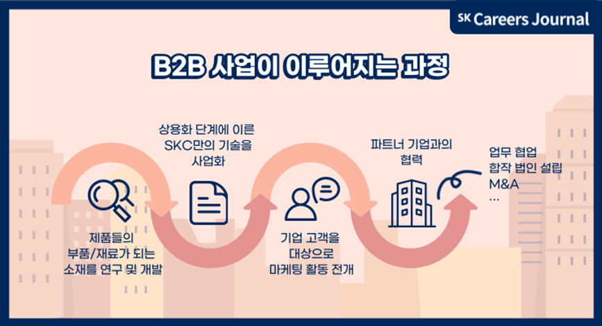 SKC의 B2B 사업은 위와 같이 이루어집니다. 제품들의 부품·재료가 되는 소재를 연구하여 개발한 SKC는, 기술의 상용화를 위해 사업화의 과정을 거칩니다. 이후 고객이 되는 기업을 대상으로 마케팅 활동을 전개하여, 파트너 기업과의 협력을 이끌어냅니다. 이는 업무 협업, 합작 법인 설립, M&A와 같은 다양한 결과로 이어질 수 있습니다.