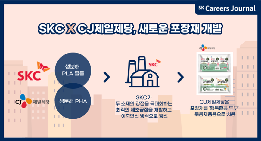 SKC와 CJ제일제당은 협력하여 새로운 포장재를 개발하였습니다. SKC는 글로벌 최고 수준의 생산 기반과 생분해 필름 제조 기술력을 제공할 수 있으며, CJ제일제당은 전 세계적으로 극소수 기업만 가지고 있는 PHA 양산 능력을 확보하였습니다. PHA란, 물질의 투명도가 높아 다양한 분야에 활용될 수 있으며 시간이 지남에 따라 해양에서 생분해가 될 수 있는 친환경 소재입니다. CJ제일제당의 PHA는 투명하고 부드러워 활용성이 높았으나, 연질 소재라 단독 포장에 사용되기에는 어려움이 있었습니다. 그래서 두 기업은 PLA와 PHA를 혼합한 새로운 포장재를 개발하여 상용화하였습니다. 이는 CJ제일제당의 “행복한콩 두부” 제품의 묶음 제품용으로 사용되고 있습니다. 우리가 흔히 보는 포장재들이 SKC의 기술이었다니, 놀라우면서도 친근한 마음이 드네요!