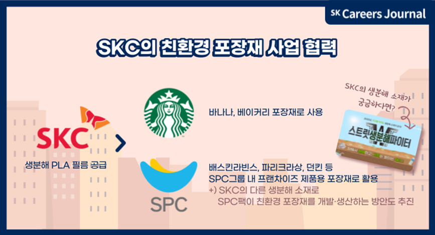 SKC는 스타벅스 코리아, SPC팩과 함께 친환경 포장재 사업 협력을 진행했습니다. 생분해 PLA 필름 포장재를 세계 최초로 상용화한 기업으로서, SKC는 2018년에 스타벅스 코리아에 바나나 포장재 공급을 시작하였으며 이듬해에는 스타벅스 코리아 베이커리 포장재로 공급을 확대했습니다. 이후 생분해 포장재 확대를 위해 SPC팩과의 ‘친환경 포장재 사업 협력 업무협약’을 진행했습니다. SKC는 생분해 필름을 공급하고, 이를 SPC팩이 배스킨라빈스, 파리크라상, 던킨 등 SPC그룹 내 프랜차이즈 제품용 포장재로 활용합니다. SKC의 다른 생분해 소재로 SPC팩이 친환경 포장재를 개발·생산하는 방안도 추진 중에 있습니다. SKC의 다양한 생분해 소재가 궁금하시다면, 이전 기사 <스트릿 생분해 파이터>를 참고하셔도 좋습니다.