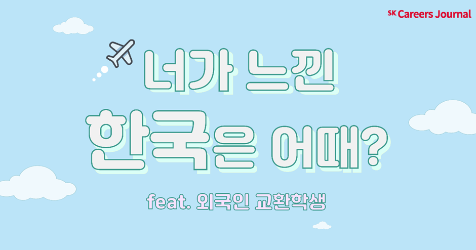 안녕하세요, 여러분~! SK Careers Editor 박승민입니다. 외국을 처음 나가 보았을 때 기분은 어떠셨나요? 가슴이 두근거리고 설레고 했던 기억들 있으시죠? 마찬가지로 외국에서 한국을 온 학생들도 설렘과 두근거림을 느꼈다고 합니다. 이번 기사에서는 한국에 교환학생 온 학생들의 한국에 대한 인상, 그리고 경험했던 것들에 대해 소개를 해드리고자 합니다! 저와 함께 친구들을 만나러 가질 준비되었나요? 지금 바로 만나보시죠!