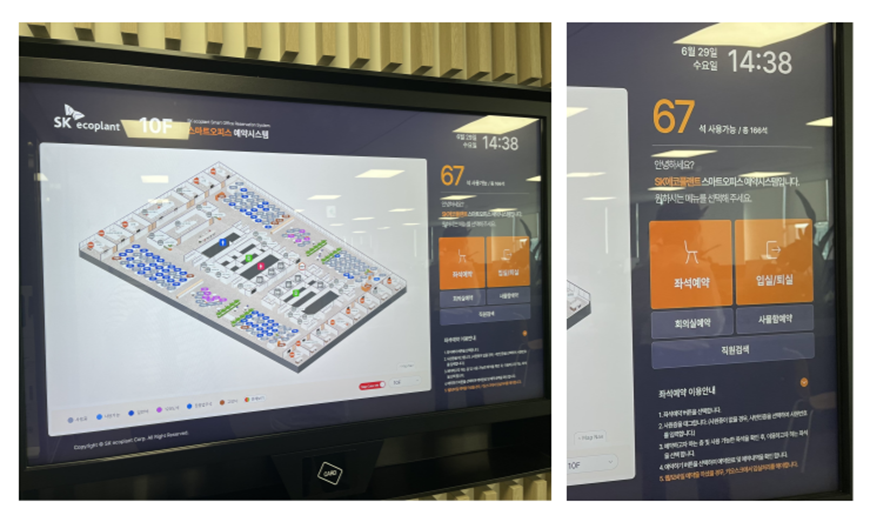 이러한 고민이 들 수도 있습니다. 하지만 구성원들은 아침에 출근해 모바일이나 PC 혹은 각 층마다 입구에 배치되어 있는 키오스크의 ‘스마트 오피스 예약시스템’에 접속해 그날 자신이 일할 자리를 예약할 수 있습니다.