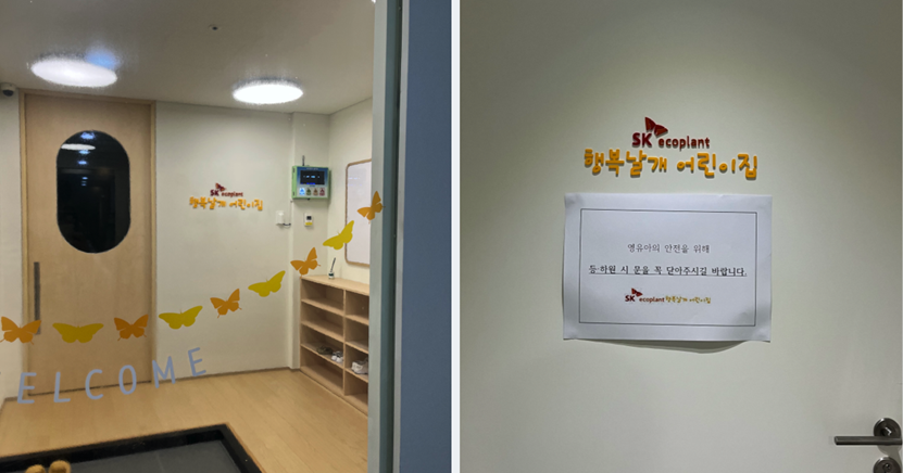 2층에는 SK에코플랜트의 사내 어린이집, ‘SK행복 날개 어린이집’도 위치하고 있습니다. 개원 초기부터 유아들을 위한 최적의 환경을 추구했다고 합니다. 우수한 보육시설과 표준보육과정 및 누리과정을 충실히 반영한 프로그램으로 미취학 어린 자녀를 둔 구성원들은 안심하고 업무에 몰입할 수 있도록 지원하고 있습니다.