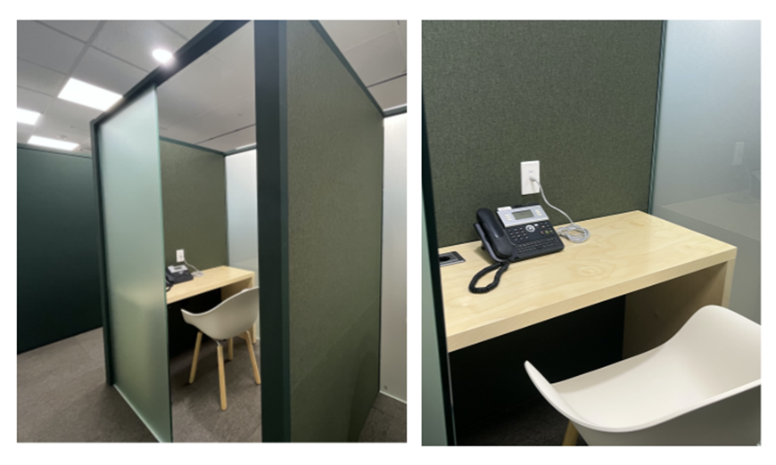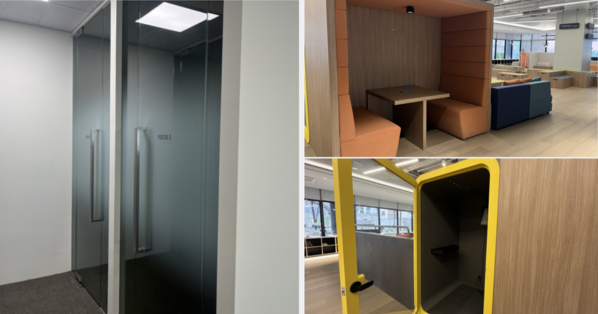 먼저 일반 사무실에서는 보기 힘든 개인공간들이 눈에 띕니다. 1인용 부스 형태의 몰입공간은 보고서 작성 및 분석 업무 등 집중력을 요구할 때 효과적인 공간이라 합니다. 또 한 켠에는 공중전화 박스처럼 생긴 폰 부스들도 있는데요. 이곳에서는 소음차단 효과가 있어 업무전화를 비롯해 개인전화가 왔을 때 조용한 환경에서 자유롭게 통화할 수 있도록 돕는다 합니다.