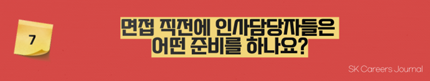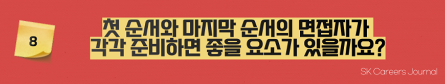 물론 하루 종일 면접이 진행된다면, 아무래도 면접관 분들께서 조금 지치실 수는 있겠죠. 하지만 면접 평가에 있어 첫 순서와 끝 순서가 다르지 않습니다. 순서와 무관한 팁을 드리자면, 면접관 분들이 그렇게 빡빡하기만 한 분들이 아니에요^^ 가끔은 내가 자신 없는 부분에 대해 날카로운 질문을 하실 때도 있겠지만, 그럴 때도 당황하고 얼버무리기보다는 알고 있는 부분에 대해 자신 있고 솔직하게 답하면 좋은 결과가 있을 거예요.