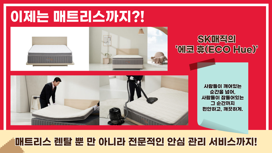 이제는 사람들의 수면, 매트리스에서도 ‘생활구독’ 캠페인을 진행하고 있습니다. 이번에 선보인 SK매직의 ‘에코 휴(ECO Hue)’ 매트리스는 친환경 소재를 적용했으며, 인체공학적인 설계를 통해 최적의 수면 환경에서 건강하고, 편안한 잠자리를 제공합니다.