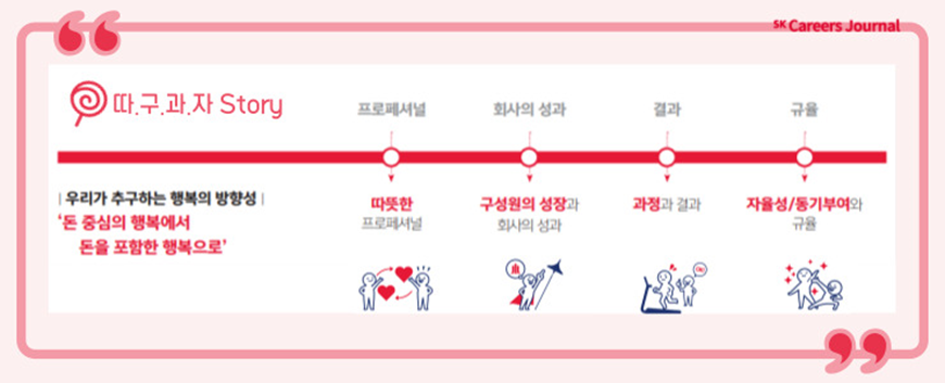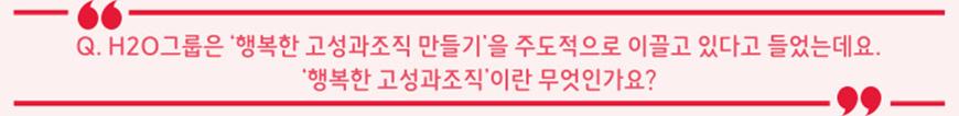 여러분은 혹시 따.구.과.자에 대해 들어보셨나요? ‘따.구.과.자’는 ‘따뜻한 프로페셔널’, ‘구성원의 성장과 회사의 성과’, ‘과정과 결과’, ‘자율성/동기부여와 규율’의 앞글자를 딴 것인데요. 오늘은 따.구.과.자의 실천을 통해 SK가스를 행복한 고성과 조직으로 만들고자 열심히 달리고 있는 H2O그룹과 이야기를 나누어보려고 합니다! 그 전에 먼저 행복한 고성과 조직과 따.구.과.자에 대해 자세히 알아보도록 하겠습니다. 😉