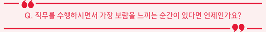 구성원들의 진심 어린 피드백과 감사메시지를 전달받았을 때입니다. ‘행복씨 대화’가 3년째 꾸준히 진행되고 있는데, 그러한 다양한 창구를 통해 구성원들의 살아있는 이야기와 피드백을 받을 때 기분이 좋습니다. 또한 저희가 구성원들을 위해 개발/실행중인 다양한 제도들을 구성원들이 실제로 활용하고, 그 후에 회사의 변화에 대한 감사 메시지를 보내줄 때, 그럴 때 일하는 보람을 가장 많이 느끼는 것 같습니다. 한 예로 작년에 그간 구성원들이 학수고대하던 어린이집이 드디어 도입되어, 2년 차 이용에 접어드는 구성원에게 메시지를 받았는데요, 구성원이 말씀주시 길 배우자와 아이 모두 어린이집에 너무 만족하면서 즐겁게 다니고 있다며 ‘아빠 회사 너무 좋다’는 이야기를 해서 자랑스러웠다고 고마움을 표시했었습니다. 그 이야기를 듣고 큰 보람을 느꼈던 기억이 나네요.