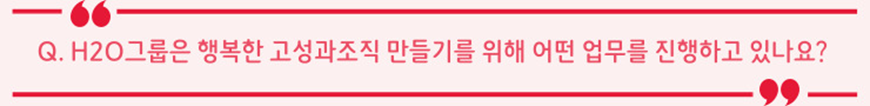 안녕하세요? H2O그룹의 이름인 ‘H2O’는 Happy High-performing Organization의 약자입니다. SK가스가 설정한 SUPEX Company의 조직과 문화 차원의 지향점인 ‘행복한 고성과 조직’ 달성을 위한 변화관리 및 구성원 육성 업무를 담당하고 있습니다. 다양한 기업문화 프로그램의 실행, 관련 제도 및 시스템의 구축, 리더십 지원 등을 통해 구성원의 몰입 환경을 구축하고 있습니다. 더불어 구성원 육성 프로그램의 기획/실행을 통해 따뜻한 프로페셔널들의 성장과 회사의 성과 창출을 지원하는 조직입니다. 윤아영 매니저가 기업문화 및 육성 전반을, 기업문화 Part는 전혜인 매니저가 그리고 육성 Part는 양성필 매니저가 주로 담당하고 있습니다.