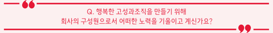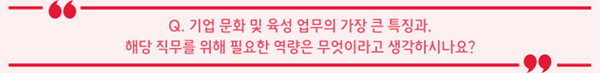 기업 문화란 결국 한 회사의 구성원들이 공유하는 행동방식, 문제해결 방식, 일하는 방식을 의미합니다. 당연히 회사를 경영하는 Top Mgmt의 철학이 반영되어 있을 수밖에 없고, 중요한 것은 회사 구성원들이 우리 회사의 철학을 함께 이해하고 공감할 수 있어야 한다는 것입니다. 이것이 잘 되어야 만 구성원들이 자긍심을 가지고 일하며, 몰입할 수 있는 환경이 조성될 수 있는 것입니다. 경영진부터 신입사원까지 모든 구성원의 다양한 목소리에 귀 기울일 수 있어야 하며, 이들의 pain-point에 늘 집중하며 공감할 수 있는 것이 중요합니다. 그렇기에 업무에 정해진 scope이나 정답이 일이 매우 많습니다. 무에서 유를 창조해 나가는 기쁨을 느낄 수 있는 직무라고 보시면 될 것 같습니다. (웃음) 이를 위해, 하나의 작은 아이디어를 제도화하는 기획력, 전사에 전파하는 전달력, 그리고 모두의 의견을 경청하는 오픈 마인드를 갖는 것이 중요하다고 생각됩니다.