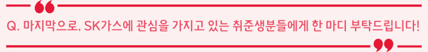 SK가스는 회사의 성장뿐 아니라 구성원이 함께 성장할 수 있는 회사입니다. 단순히 인격적으로 따뜻한 사람이 아니라, 즐겁게 몰입하여 일하며 따뜻한 프로페셔널로 성장해 나가는, 에너지의 미래를 함께 만들어갈 여러분을 기다리겠습니다!