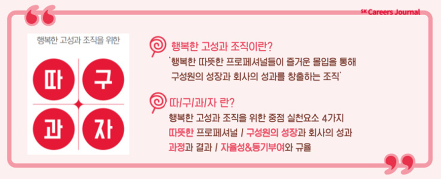 SK가스를 행복한 고성과 조직으로 만들기 위해 필요한 여러 요소들 중 우선적인 실천이 필요한 4가지를 정리한 것이 바로 따.구.과.자 인데요. 그럼 따.구.과.자 각각의 의미와 구체적인 실천 방법까지 함께 살펴보시죠!