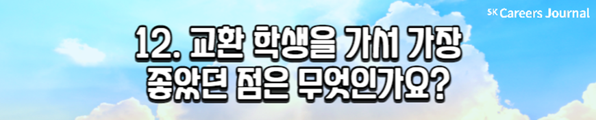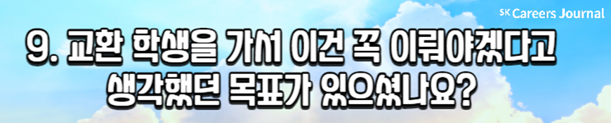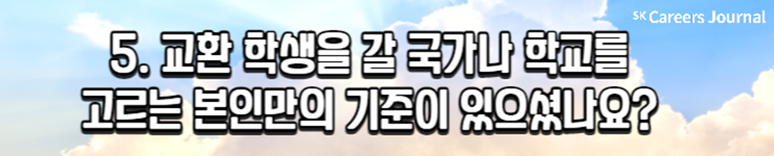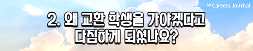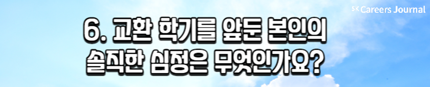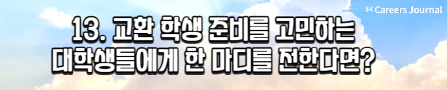 오늘은 ‘교환 학생’을 주제로 세 명의 대학생을 만나 보았습니다. 최근 교환 학생을 합격해 교환 학기를 앞두고 있는 대학생과, 이미 교환 학기를 경험한 대학생까지! 생생하며 솔직한 이야기들을 담아 보았는데요, 이로써 교환 학생에 대한 여러분의 고민과 어려움이 조금 해결되었나요?