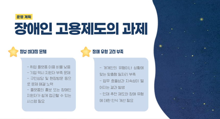 다음으로, 장애 유형 고려 부족 문제가 있습니다. 장애인은 개개인의 유형이나 상황에 맞는 맞춤형 일자리를 찾기 어렵습니다. 장애인의 특성에 맞는 직무중심 고용서비스가 필요한데, 현재의 취업 플랫폼은 그러한 기능이 부족하다는 목소리가 높습니다. 기업의 직무에 맞는 장애 유형 등을 종합적으로 고려하고, 일반 채용 과정처럼 직군별 맞춤 인재 추천 제도를 만드는 것이 우리의 과제라고 볼 수 있습니다.