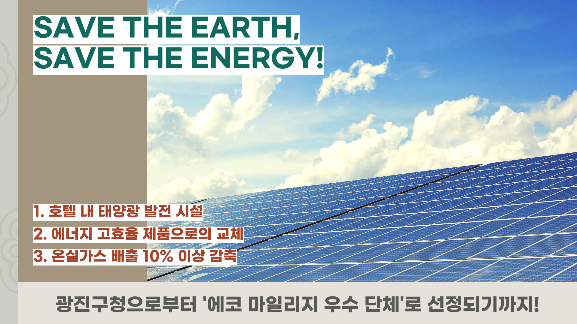 다음으로는 워커힐의 “SAVE THE EARTH, SAVE THE ENERGY” 프로젝트인데요. 워커힐 호텔앤리조트는 탄소발자국을 줄이고자 호텔 내 태양광 발전 시설을 운영하고, 조명과 냉난방 장비들을 에너지 고효율 제품으로 교체함으로써 에너지 절약을 위한 활동들을 적극적으로 펼쳐나가고 있습니다.