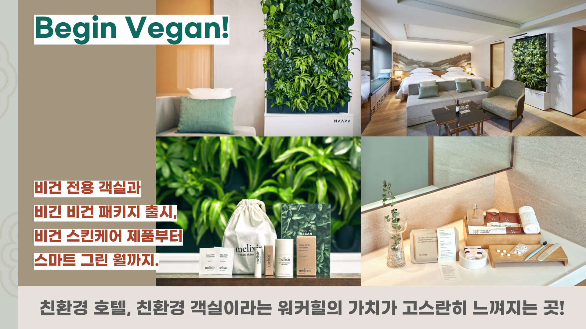 아주 사소한 어메니티부터 객실 내 비치해 둔 스마트 그린 월까지, 워커힐 호텔앤리조트의 ‘비긴 비건’ 패키지는 철저하게 ‘친환경 호텔’, ‘친환경 객실’이라는 그들의 신념과 가치를 지켜내고 있습니다.