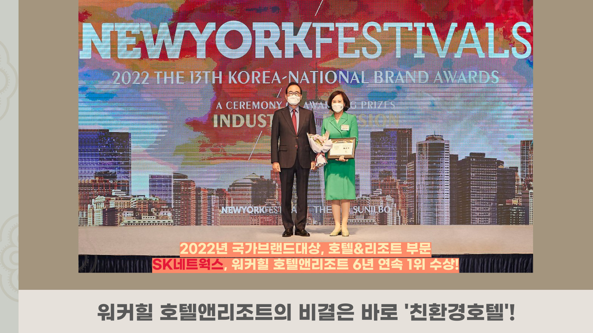 여러분, 혹시 워커힐 호텔앤리조트가 SK네트웍스의 자회사라는 것을 알고 계신가요? 이번에 저희 SK네트웍스의 워커힐 호텔앤리조트가 2022년 국가브랜드대상, 호텔&리조트 부문에서 6년 연속 1위를 수상하였다고 합니다!