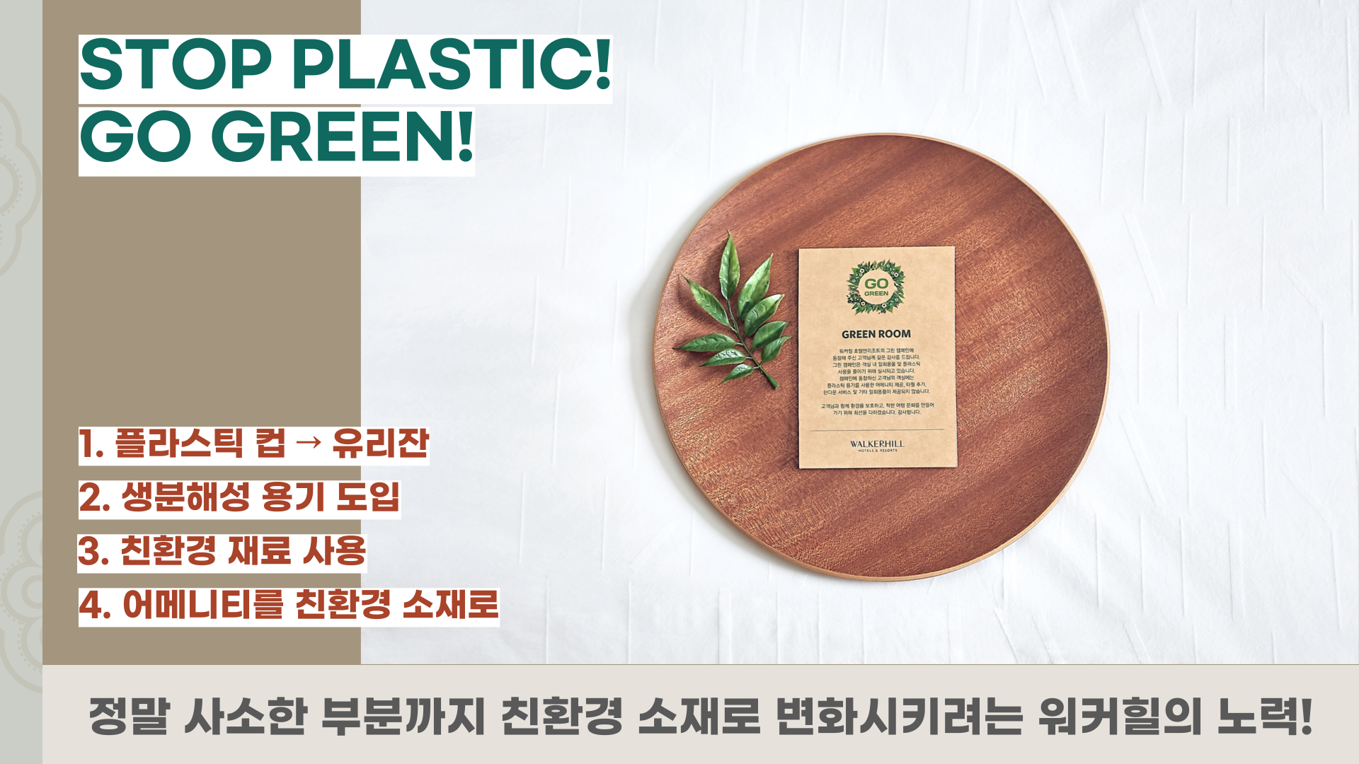워커힐의 ESG경영은 크게 두 가지 측면으로 나누어볼 수 있을 것 같은데요. 먼저 플라스틱 폐기물을 줄이는 STOP 플라스틱, “GO GREEN” 캠페인입니다.