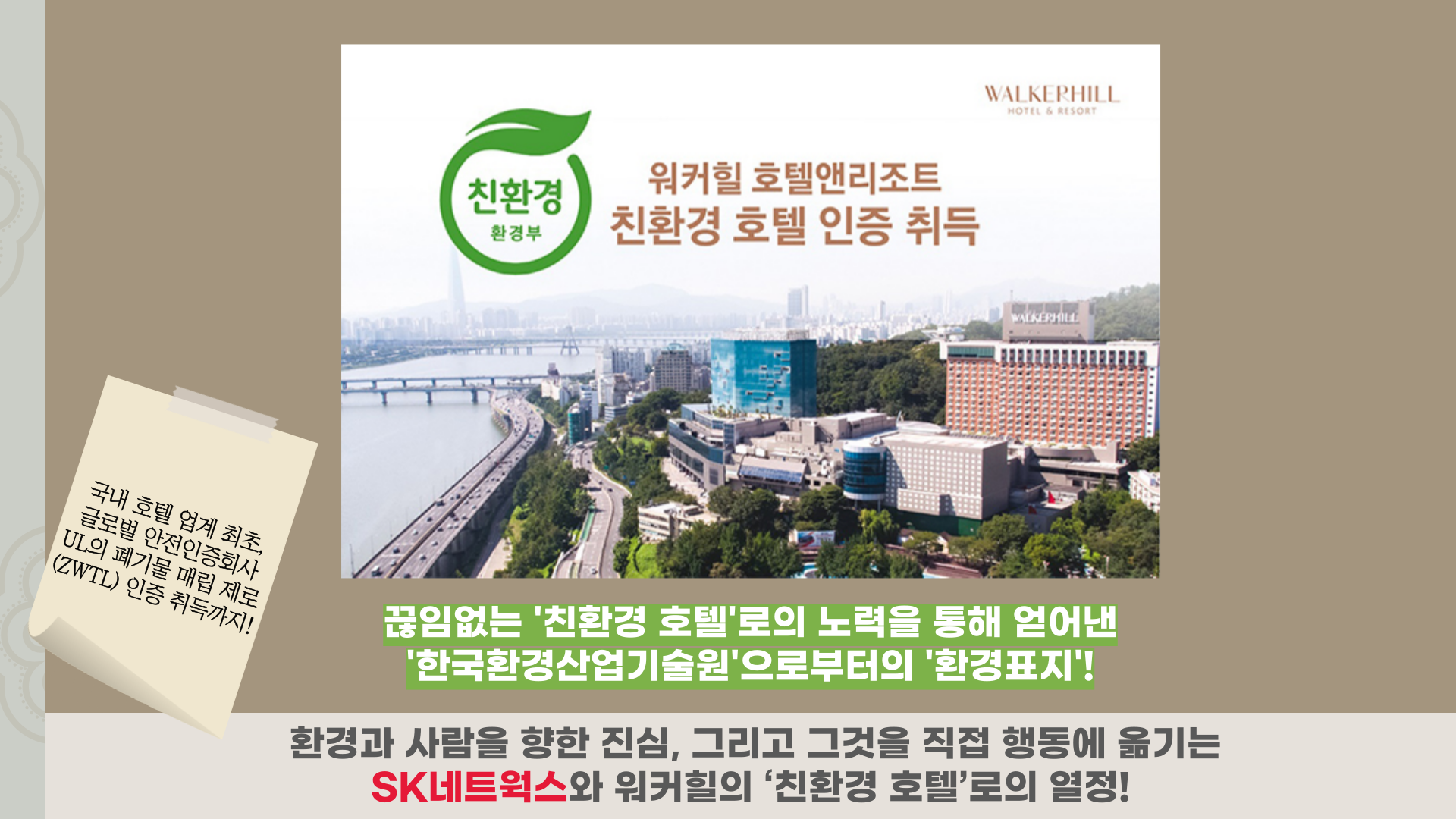 SK네트웍스와 워커힐 호텔앤리조트의 세심한 노력, 적극적인 실천이 어우러져 2021년 11월, 환경부 산하 ‘한국환경산업기술원’으로부터 친환경 시설로 공인받는 ‘환경표지’를 취득하였고, 같은 해 12월, 국내 호텔 업계 최초로 글로벌 안전인증회사 UL의 ‘폐기물 매립 제로(ZWTL)’ 인증을 취득하였습니다.