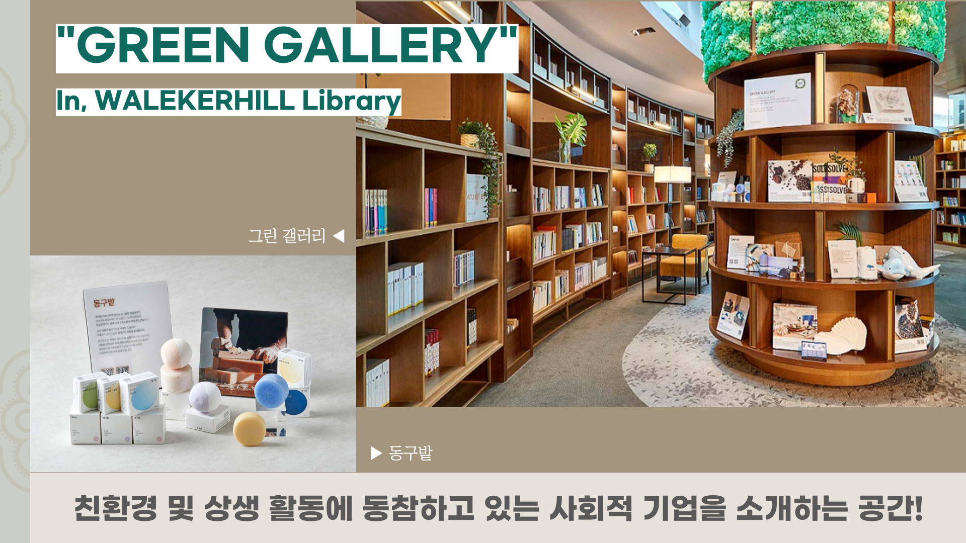 워커힐의 ESG경영은 여기서 끝나지 않는데요. 워커힐 호텔앤리조트는 워커힐 호텔 내 위치한 ‘워커힐 라이브러리’에 ‘그린갤러리’라는 공간을 지난 2021년, 새롭게 마련하였습니다.