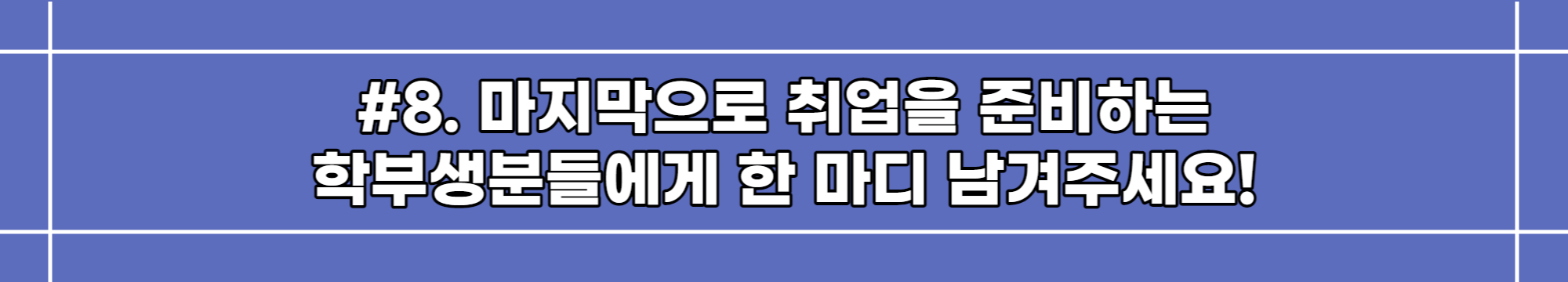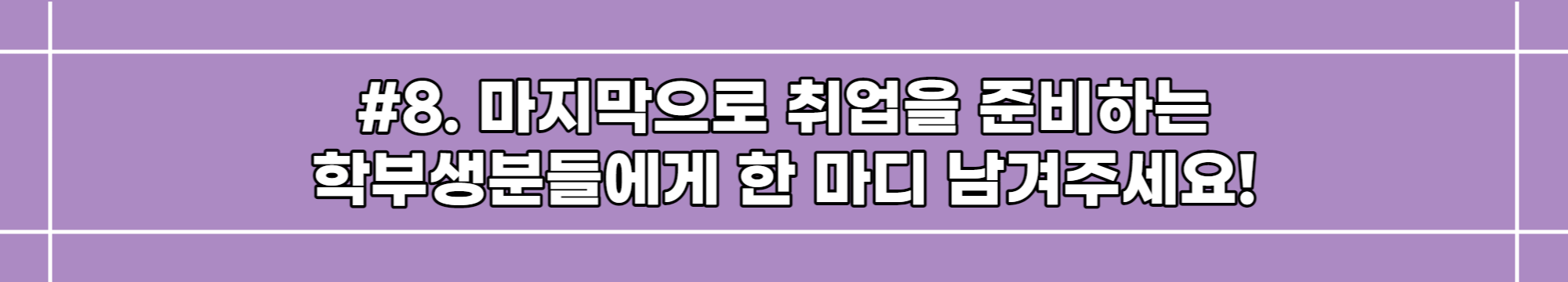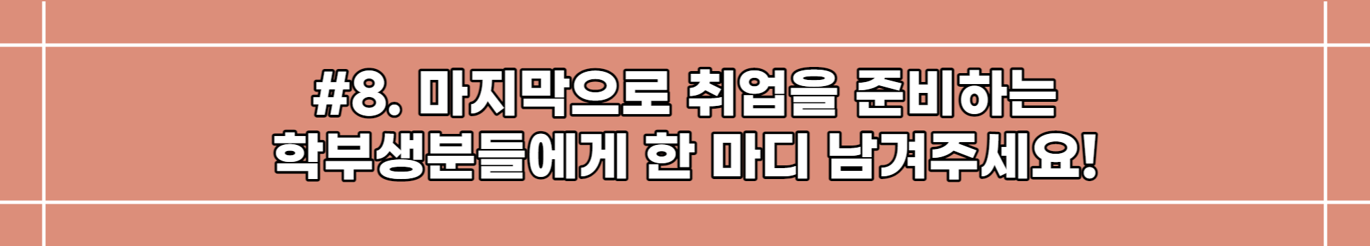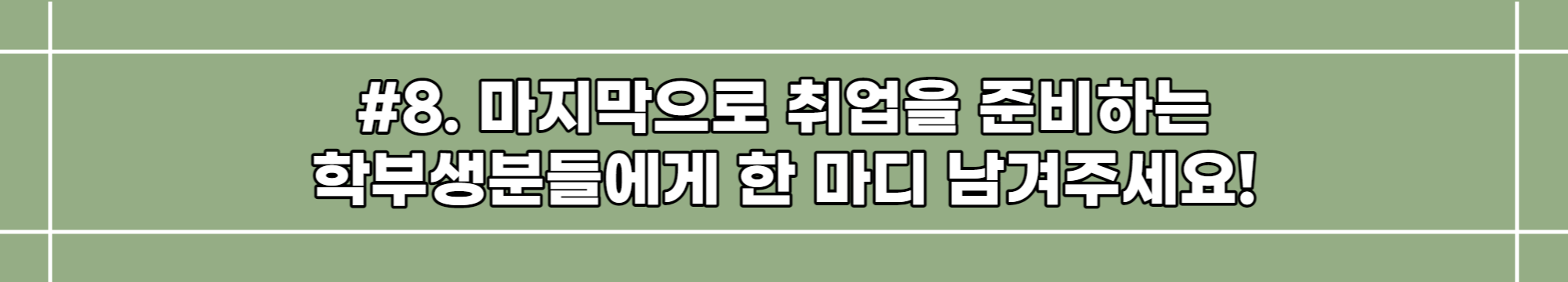 취업준비 과정이 무작정 좋은 스펙을 쌓기 위한 시간이라고 생각하지 말고, 보다 자신이 어떤 사람인지, 무엇을 좋아하는지 고민하고 찾아가는 시간이라고 여기신다면 지치지 않고, 또 넘어져도 다시 일어날 수 있는 힘이 생길 거라고 생각해요. 사회로 발걸음을 내딛기 전, 삶의 방향을 결정지을 중요한 이 시기를 함께 진득하게, 또 즐겁게 잘 보냈으면 좋겠습니다!