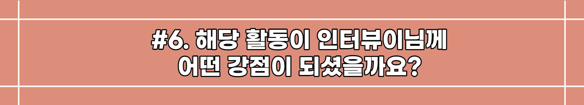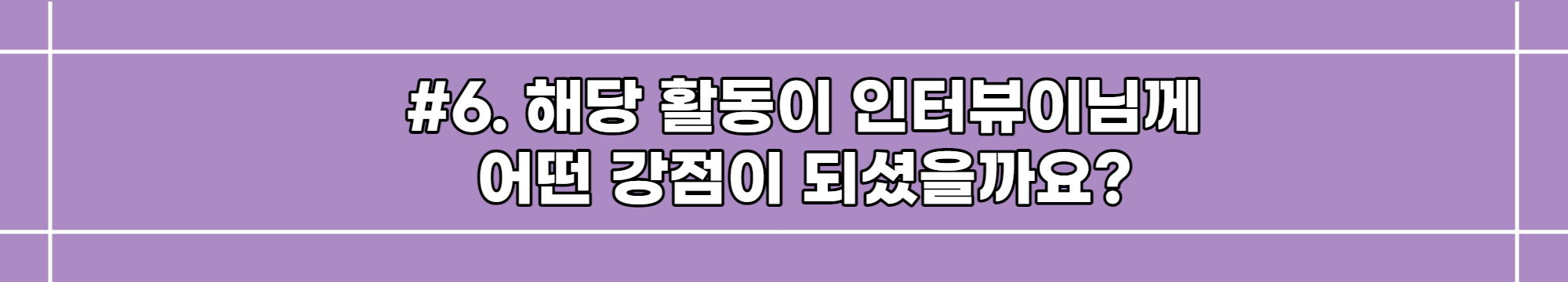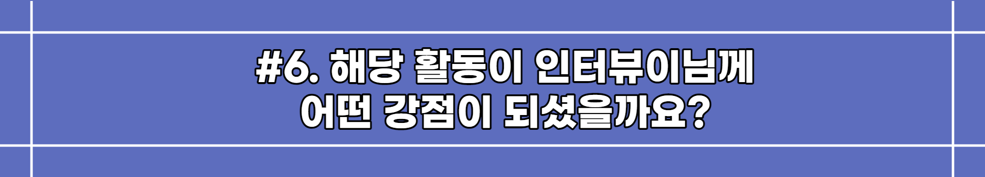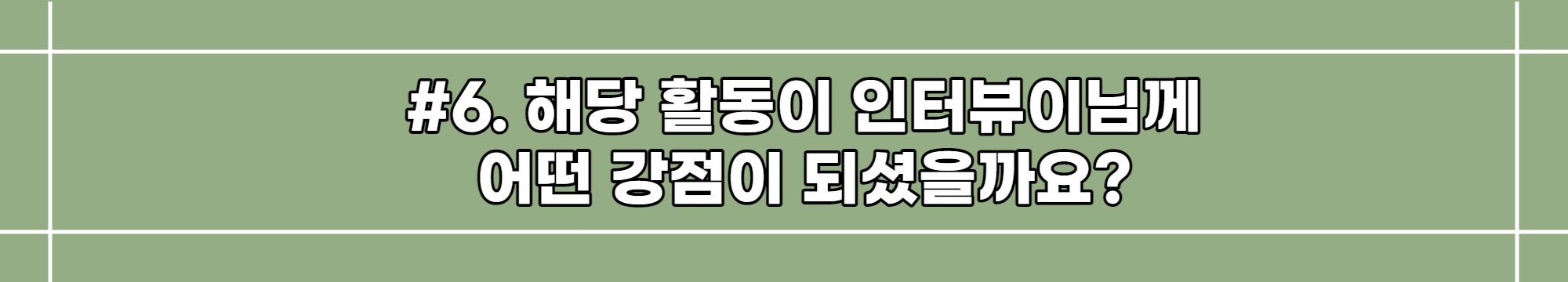 우선 SK관계사 내에서 진행중인 여러 프로젝트들을 인터뷰이분들을 통해 가까이서 접하며 해당 업무들의 구체적인 프로세스를 보다 상세히 알게 되었다는 것, 그리고 SK 공식 홈페이지에 제가 직접 만든 게시물들이 업로드되어 있다는 것이 큰 강점이라 생각합니다. 더하여 꾸준히 컨텐츠를 제작하다보면 하나의 컨텐츠에 집중하여 기존의 방향성이나 목적 등을 잃어버릴 수도 있는데 이번 SKCE 활동을 통해 그 목적을 까먹지 않으면서도 개별 컨텐츠의 퀄리티를 높이는 데 집중하는 힘을 기를 수 있었고, 이것이 저의 강점이 되었다고 느껴집니다.