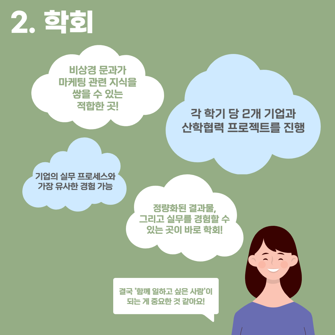 비상경 문과, 공모전 수상 이력 없음, 이러한 약점들을 학회의 프로젝트를 기반으로 한 실무 경험 및 커뮤니케이션 능력이 인턴 합격에 많은 도움을 주었습니다. 학회 자체가 해답은 아니더라도 약점을 극복하기에 좋은 수단이 된다고 생각합니다. 결국 기업이 보는 것은 전공 지식과 실무 경험의 유무보다 지금까지 경험한 활동들의 구체적인 내용과 깊이, 해당 사례들이 지원자의 역량과 연결되는 흐름이라고 느꼈습니다. 그러한 경력이 없다면, 학부생에게 학회는 자신의 역량, 직무 연관성, 직무에 대한 관심 등을 어필하기에 최적의 활동이라 생각합니다.