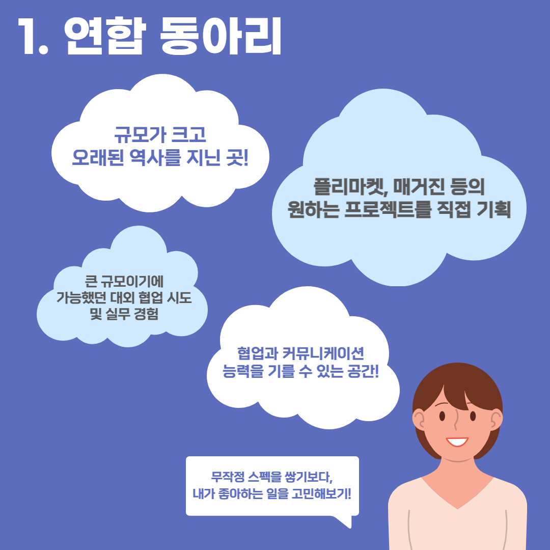 규모가 큰 연합 동아리이기에 여러 전공의 사람들로부터 다양한 관점을 접할 수 있다는 점, 그리고 매 학기마다 원하는 프로젝트를 기획하고 실행할 수 있다는 자율성이 큰 장점이었습니다. 특히 열린 사고와 많은 경험이 중요시되는 패션 분야에서 폭넓은 교류와 높은 자율성은 더욱 차별점이 있었다고 생각합니다.