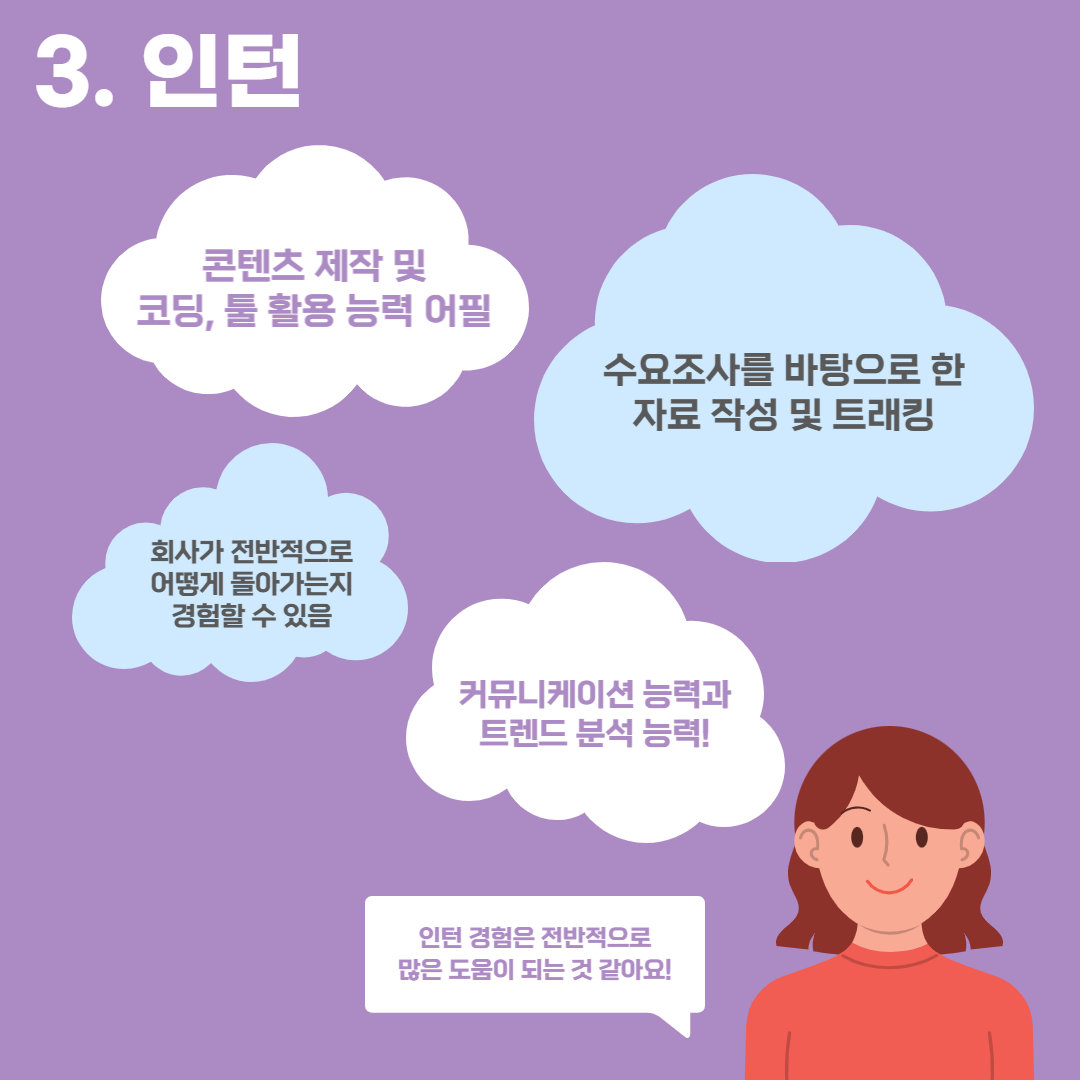 인턴은 전반적으로 큰 도움이 되었습니다. 업무를 진행하며 길러진 꼼꼼함, 커뮤니케이션 능력을 자기소개서나 포트폴리오를 통해 실무와 연관지어 잘 풀어낼 수 있고, 애정하는 회사에서의 실질적인 기여를 해 본 경험을 통해 저만의 스토리도 풀어낼 수 있으니까요.