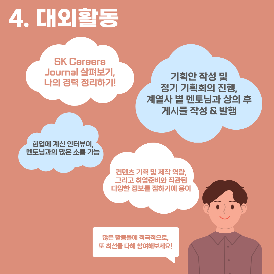 취업준비를 위해 자기소개서 및 포트폴리오를 작성하다보면 대부분의 기업들이 구체화되고 수치화된 자료들을 요구하며, 또 그렇지 않아도 마땅히 그렇게 전달하는 것이 훨씬 더 인사담당자분들을 설득하기에 좋은 방식이라 생각합니다. 이러한 이유로 SKCE 활동은 매월 업로드한 게시물들이 현재 SK 공식 홈페이지에 업로드되어 있다는 것, 그리고 발행된 컨텐츠들을 통해 드러내보일 수 있는 저만의 강점을 어필하기에 용이했습니다. 더하여 멘토님께서, 또 관계사에 계신 많은 인터뷰이분들이 전해주신 말씀들이 취업준비를 하는 데 있어 큰 도움이 되었습니다.