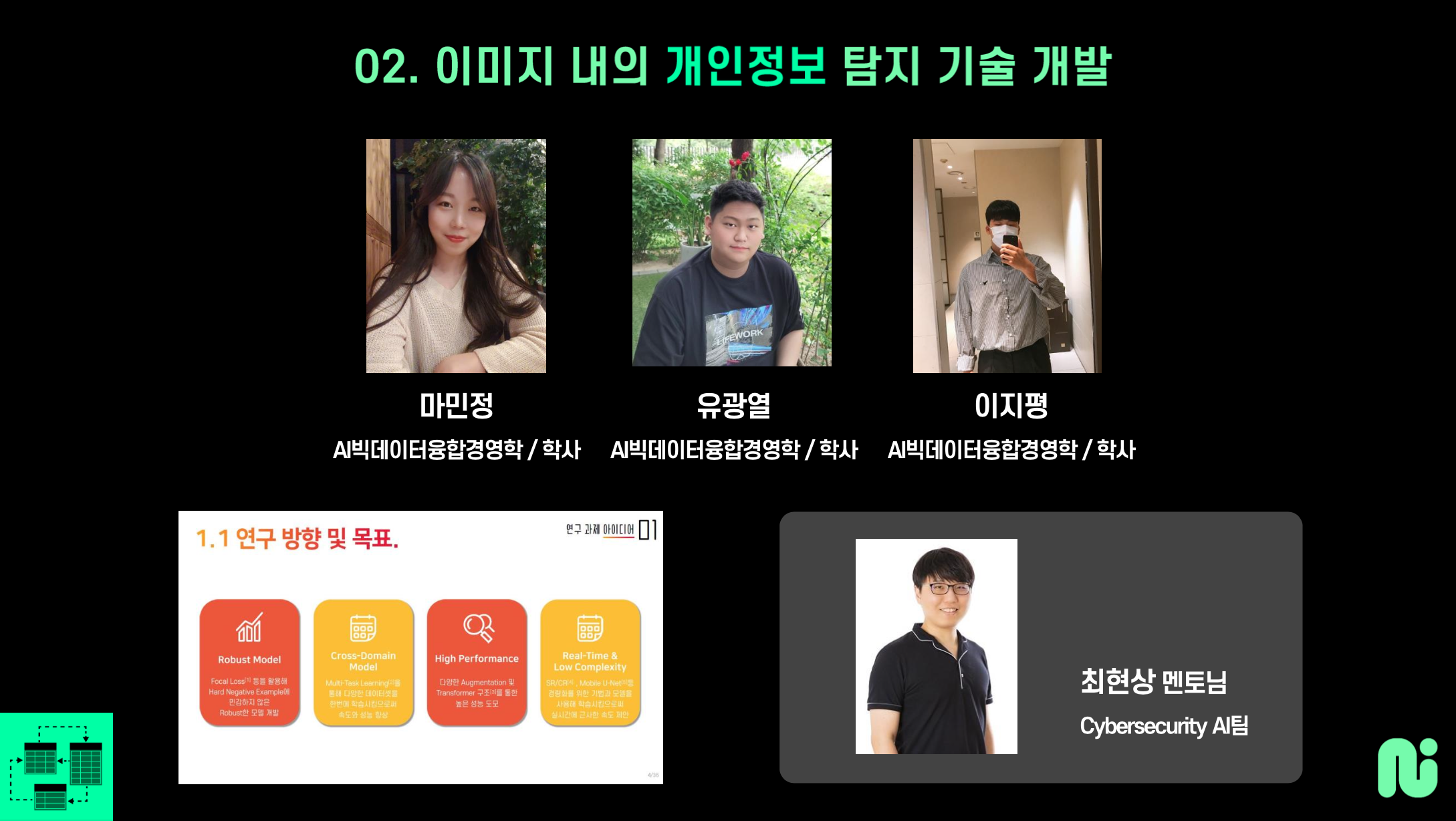 마민정 : 저희는 개인 정보라고 할 수 있는 다양한 정보들(ex. 얼굴, 이름, 주소, 신분증, 전화번호, 계좌번호 등)을 모두 탐지할 수 있는 실시간 모델을 만들고자 합니다. 현재 존재하는 PII Detection Task와는 다르게 저희는 각 개인 정보에 따른 기술 적용을 목표로 하고 있습니다. 예를 들어 얼굴 탐지는 딥러닝 기술을 활용한 Object Detection, Classification, 이름 및 주소 탐지는 OCR, NER을 사용했으며 카드번호, 계좌번호 탐지는 Regular Expression 등의 기술을 사용해 각각의 개인 정보에 맞춤화된 탐지 기술을 개발 중에 있습니다. 낮은 해상도에서의 정확성, 실시간으로 돌아갈 수 있을 만한 속도, End-to-End 기반 낮은 복잡성 등을 모두 고려해서 구현 중이기 때문에 이가 완성된다면 엄청난 경쟁력을 가질 것이라 생각합니다.