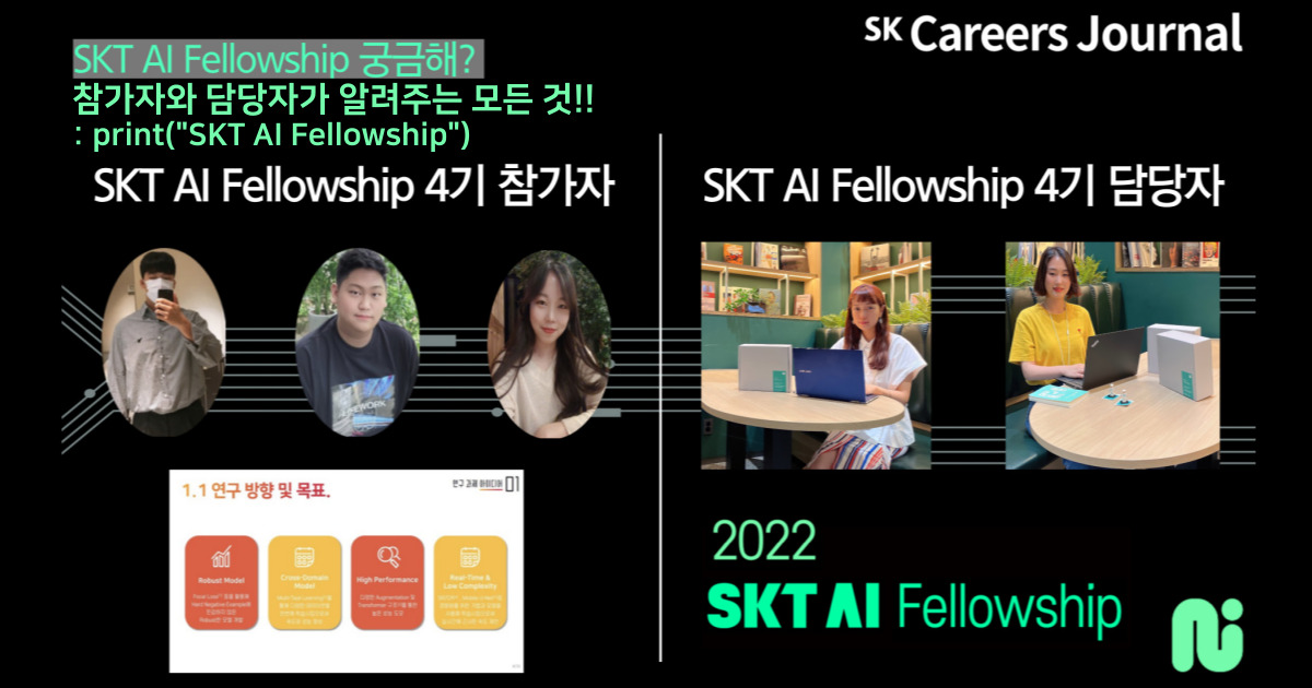 오늘은 SK텔레콤이 국내 AI 인재 양성을 위해 운영하고 있는 ‘SKT AI Fellowship’에 대해 소개하려 하는데요. 단순 프로그램 내용에 대한 이야기 보다 실제로 프로그램에 참여하는 참가자와 프로그램 담당자의 밀착 인터뷰를 통해 보다 자세한 내용을 알아보았습니다!