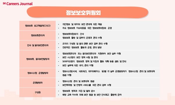 그렇다면 정보보호위원회에서는 어떤 일들을 수행하고 있을지 궁금하실 것 같은데요, SK바이오팜의 정보보호위원회는 모든 부서 및 전 구성원의 정보보호 관련 활동에 대해 심의하고 관련 의사결정을 내리고 있습니다. 정보보호위원회는 정보보호 최고책임자, 정보보호 관리자 및 중요 유관부서의 대표자로 구성되어 있으며 각 부서별로 이름은 유사하지만, 정보보호를 위해 수행하는 각자의 업무는 명확히 구분되어 있습니다. 또한 최고책임자의 주도 하에 담당자들은 본인의 업무를 성실히 수행하고 있습니다. 자세한 내용은 아래의 표를 통해 확인해 보실 수 있습니다.