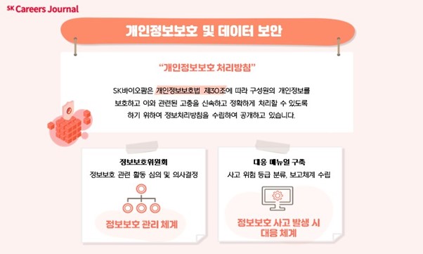 독자님들은 개인정보보호와 관련해서 회원가입 시 약관에 대한 ‘동의하기’를 가장 많이 접해 보셨을 것 같은데요, 개인정보보호 처리 방침은 ‘개인정보의 처리 목적, 처리하는 개인정보의 항목’ 등의 내용을 포함하고 있습니다. SK바이오팜은 개인정보보호법 제30조에 따라 구성원의 개인정보를 보호하고, 이와 관련된 고충을 신속하게 처리할 수 있도록 하기 위해 정보처리방침을 수립해 공개하고 있습니다.