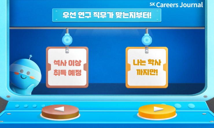 오늘 직무 적성 테스트 어떠셨나요? 언뜻 이름만 들어서는 비슷해 보이는 연구직무도, 이렇게 다양한 분야가 있다는 것이 새삼 놀랍기도 합니다! 어떤 직무가 잘 맞을지 충분히 고민하는 시간을 가져보시면 명확한 진로를 설정할 수 있을 것이라고 생각합니다. 원하는 직무에 취업 성공하시기를 SKCE가 언제나 응원하겠습니다😊