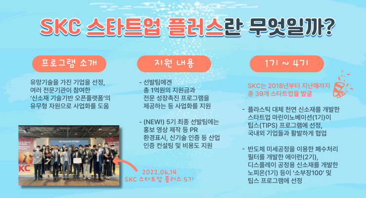 ‘SKC 스타트업 플러스’는 유망기술을 가진 기업을 선정해 여러 전문기관이 참여한 ‘신소재 기술기반 오픈플랫폼’의 유무형 자원으로 사업화를 돕는 프로그램입니다. 사업화를 돕는 방법으로는 지원금 제공과 프로그램 제공으로 나뉘는데요, 공모전을 통해 선발된 팀에겐 총 1억원의 사업화 지원금과 전문 성장촉진 프로그램을 제공한다고 합니다. 특별히 이번 5기에서는, 최종 선발팀에 홍보 영상 제작 등 PR 고도화 지원과 환경 표시, 신기술 인증 등 산업 인증 컨설팅 및 비용도 지원한다고 합니다. 기수를 거듭하며 지원 내용이 더욱 다채로워진 만큼 그 결과가 기대되네요!