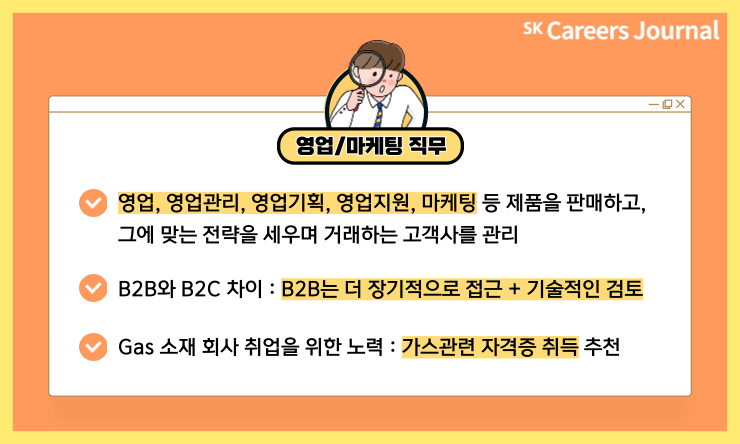 Gas&IT 소재 회사의 마케팅 직무에 취업하려면 어떻게 하면 좋을까요? 산업 관련 기본 지식은 물론, 직무 기본 소양도 갖추어야 할 것입니다. 또한 일반적인 B2C 기업의 영업/마케팅 직무를 준비하는 것과는 방향성도 다를 것입니다. 과연 어떤 것들을 준비해야 할지, 막막하신 분들을 위해 제가 SK머티리얼즈에어플러스 영업/마케팅 직무를 담당하시는 인터뷰이님을 만나보았습니다! 해당 직무 및 취업 꿀팁에 대한 인터뷰, 지금 바로 만나보시죠!