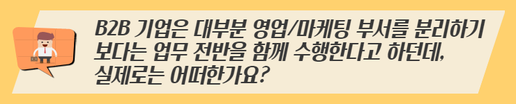 말씀하신 것과 같이 당사의 경우 영업팀에서 영업, 영업관리, 영업기획, 영업지원, 마케팅 등의 역할을 함께 수행하고 있습니다. 그렇지만 B2B 기업이라 한 부서에서 모두 업무를 수행하는 것은 아니고, 기업마다 차이가 있는 것 같습니다.