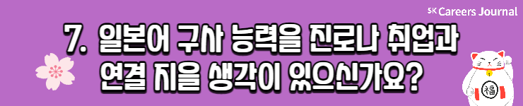 사실 지금 일본어를 공부하는 큰 이유는 ‘일본 문화에 대한 관심과 배운 일본어를 기억하기 위함’입니다. 일본어를 공부하면서 진로나 취업으로 엮기보다는 ‘일본어 공부 자체의 흥미’를 유지하며 실력을 키워 나갈 생각입니다. 그러다 현지인과 자유로운 소통을 할 수 있는 수준까지 이른다면, 그 능력을 활용하여 취업과 연결시킬 생각은 있습니다.