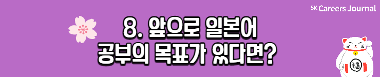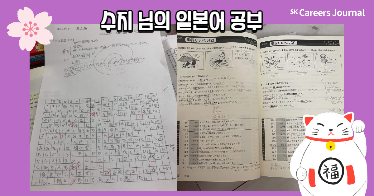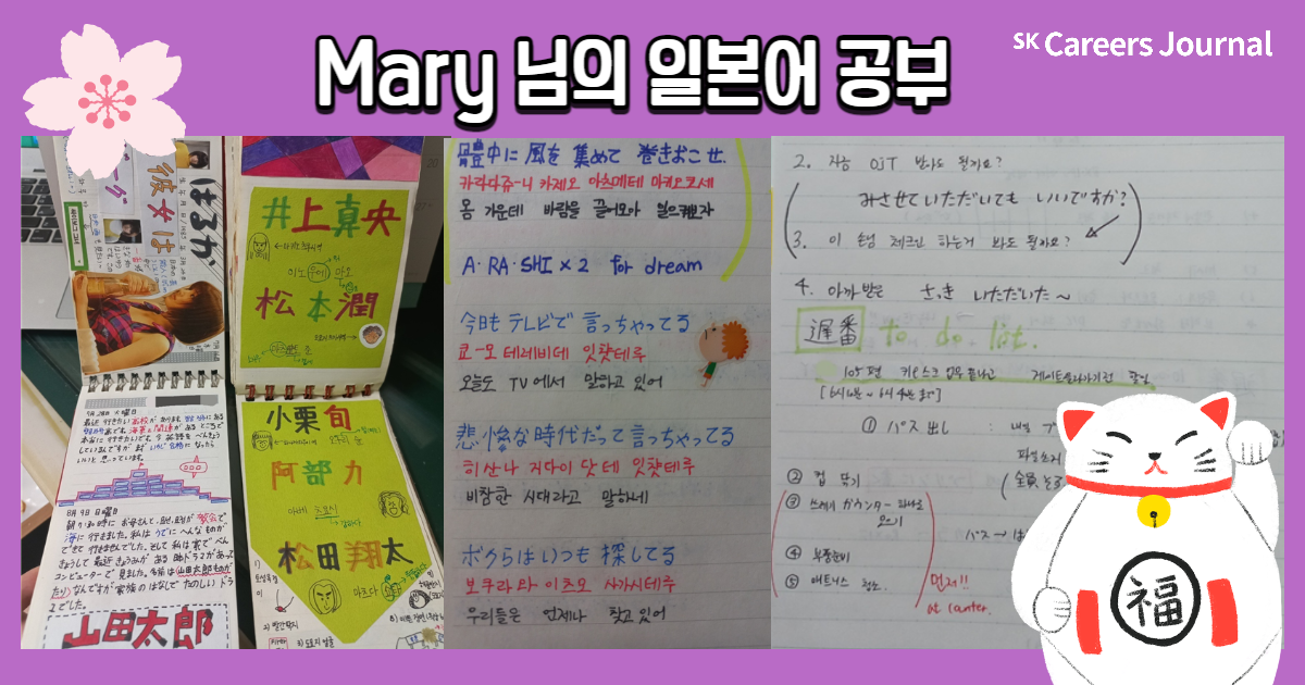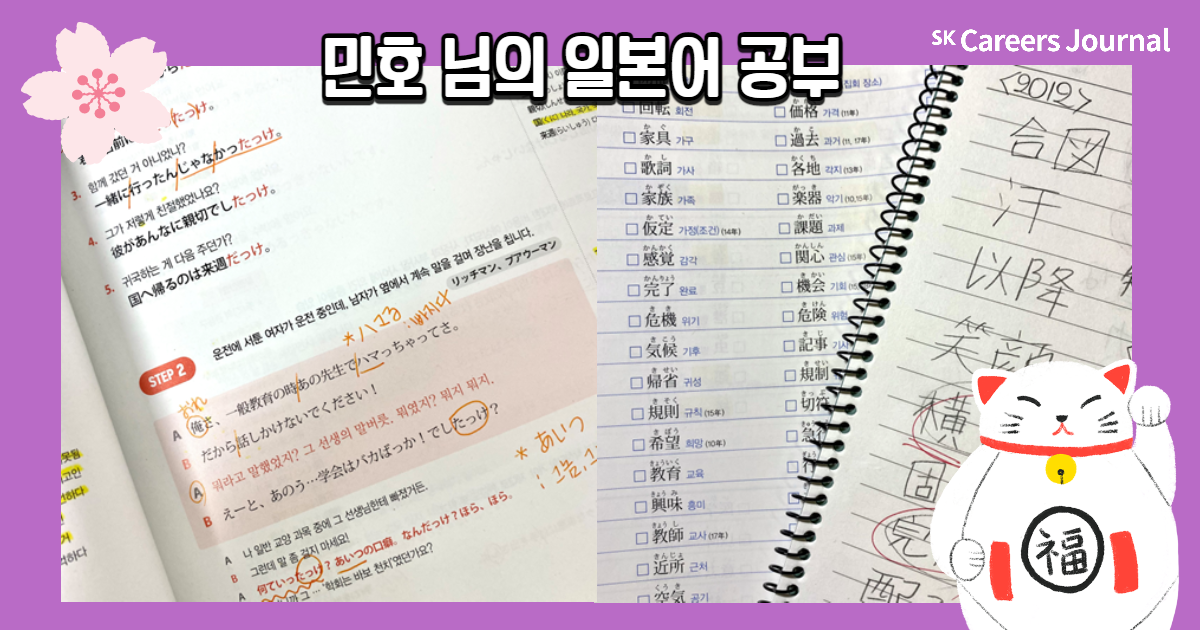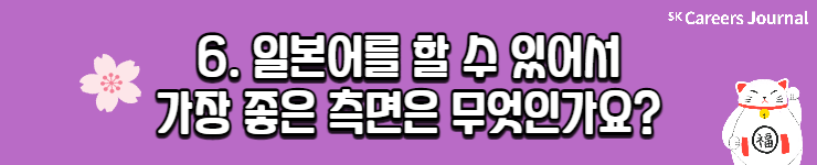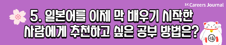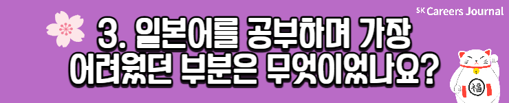 세 분의 각기 다른 일본어 공부법, 자세히 알게 되셨나요? 이번 글을 읽으신 분들 모두 원하는 제2외국어 공부 성공적으로 해 나가시길 응원합니다! 또 일본어를 마침 공부하려 하셨던 분들은 본 글을 읽고 다양한 꿀팁을 얻어 나가셨으면 좋겠네요😊 지금까지 SK Careers Editor 김희은이었습니다. 감사합니다.
