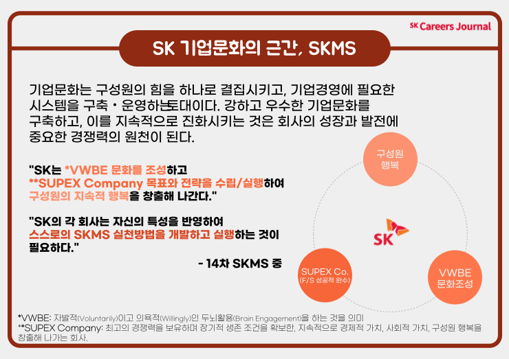 “기업문화는 회사의 성장과 발전에 중요한 경쟁력의 원천이 되며, SK는 VWBE 문화를 조성하고 SUPEX Company 목표와 전략을 수집해 구성원의 지속적 행복을 창출해 나간다.