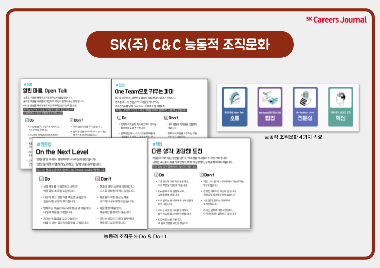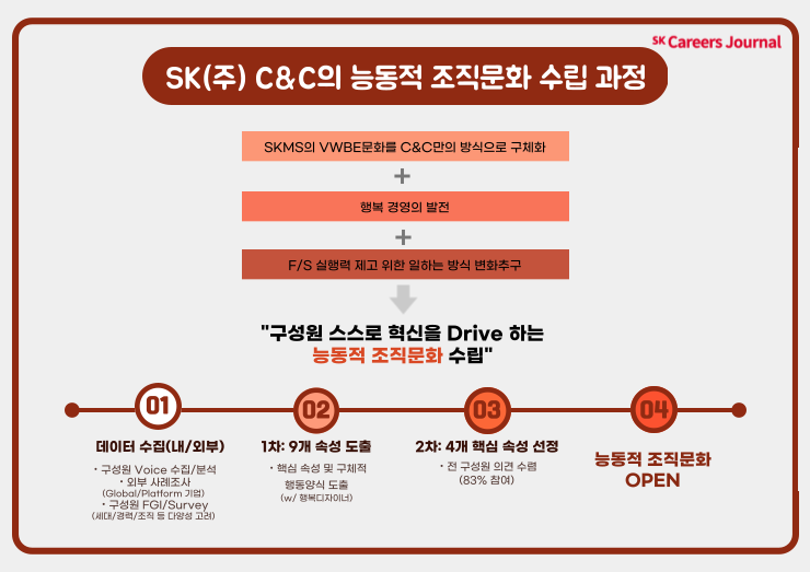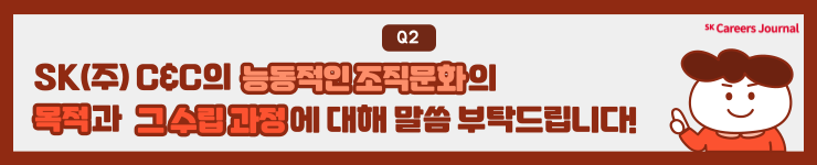 SK(주) C&C는 기업의 특성에 따라 구성원의 지속적 행복을 위해 능동적 조직문화를 수립, 실행하고 있는데요,