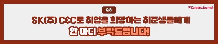 특히 저희 SK(주) C&C는 구성원들의 행복이나 성장에 대해 많은 관심을 기울이고 전개해 나가고 있습니다. 무엇보다 본인의 역량이나 능력을 회사와 함께 키워 나갈 수 있는 좋은 회사라고 생각합니다.